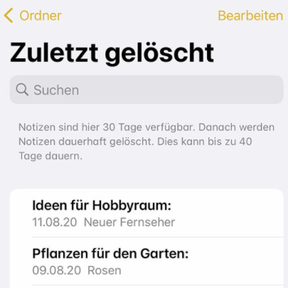 Tipp: Nach dem Löschen von Notizen vom iPhone werden die gelöschten Notizen nicht sofort entfernt. Stattdessen werden sie innerhalb eines begrenzten Zeitraums in den Ordner „Zuletzt gelöscht“ verschoben.