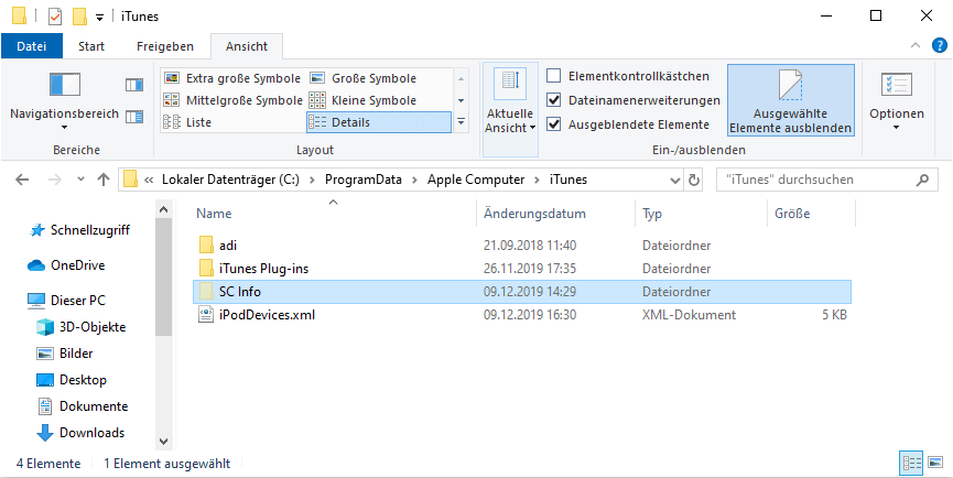 SC Info ist ein Ordner zum Aufzeichnen der Autorisierung für den Computer. Und Sie können versuchen, es von Ihrem Computer zu entfernen, und iTunes kann neue SC-Informationen erstellen. Auf diese Weise können Sie das Problem „Temporäres Problem mit iTunes“ beheben.