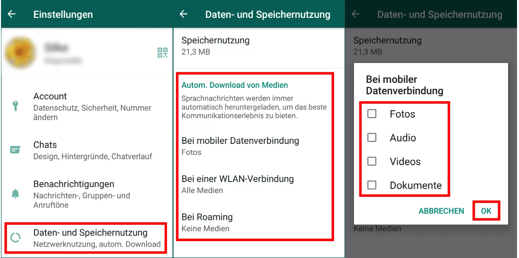 Schritt 2. Wählen Sie unter „Autom. Download von Medien“ eine der folgenden Optionen: Bei mobiler Datenverbindung, Bei einer WLAN-Verbindung, Bei Roaming > Stellen Sie sicher, dass Video ausgewählt ist > Tippen Sie abschließend auf OK.