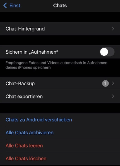 Falls Sie nicht auf die heruntergeladenen Videos auf Ihrem iPhone zugreifen können, gehen Sie bitte zurück zu WhatsApp Einstellungen > Chats und stellen Sie sicher, dass Sichern in Aufnahmen aktiviert ist.