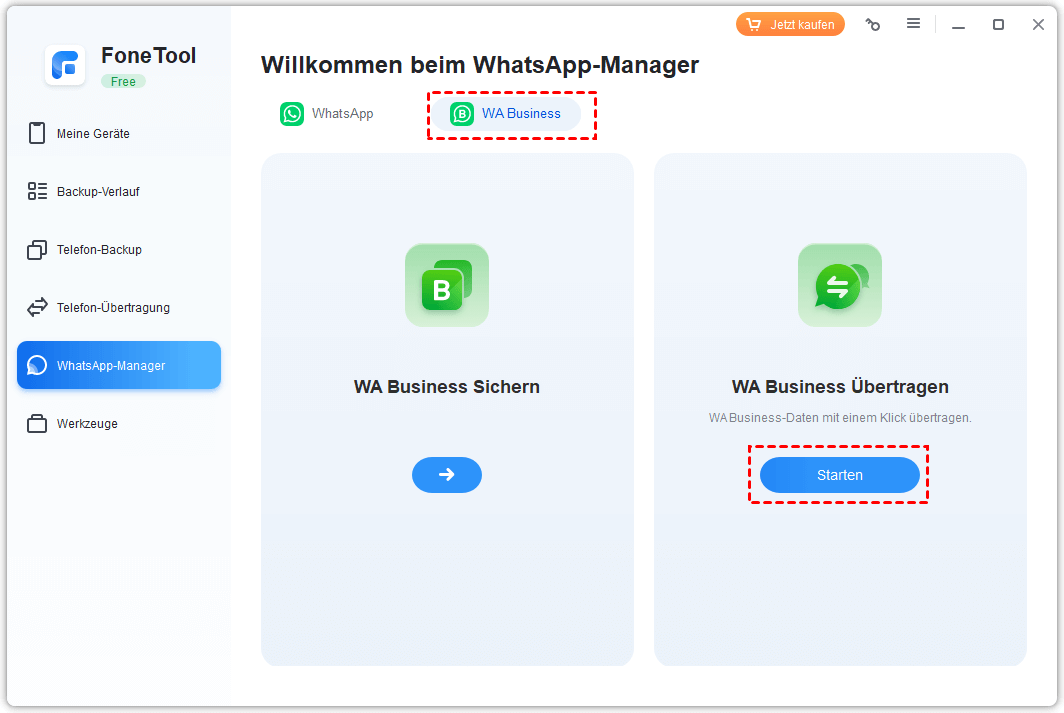Schritt 3. Wählen Sie WhatsApp Manager > Wählen Sie WA Business > Klicken Sie unter WhatsApp übertragen auf Starten.