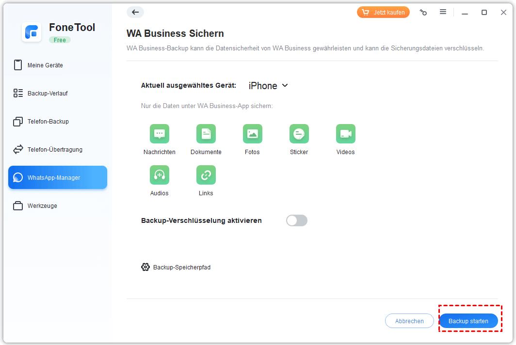 Um die Sache einfacher zu machen, können Sie sich an eine professionelle WhatsApp-Backup-Software namens FoneTool wenden. Mit dem kostenlosen Telefon-Tool können Sie WhatsApp Business-Nachrichten, Bilder, Videos, Aufkleber und andere Anhänge ganz einfach sichern. Ihre WhatsApp-Daten werden sicher geschützt.