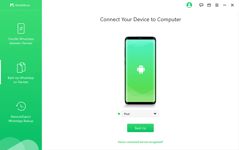 Schritt 2. Starten Sie WhatsMover und klicken im linken Bereich auf die Option WhatsApp auf Geräten sichern > Klicken Sie zur Bestätigung auf Sichern.