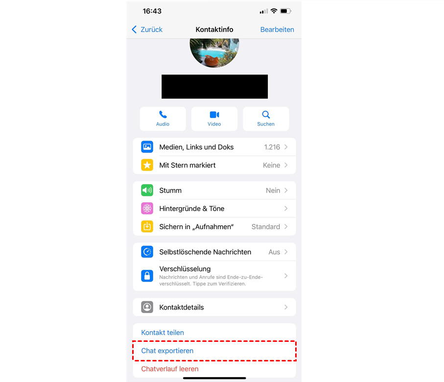 Schritt 1. Öffnen Sie auf Ihrem iPhone WhatsApp und klicken Sie auf den Chat, den Sie exportieren möchten > Tippen Sie auf den Namen des Kontakts > Tippen Sie auf Chat exportieren.
