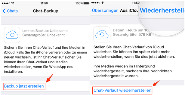 Auf einem iPhone können Sie WhatsApp in iCloud sichern. Das Backup kann auf jedem iPhone wiederhergestellt werden, das dieselbe Apple-ID verwendet. Mit dieser Funktion können Sie WhatsApp Nachrichten von iPhone auf iPhone kostenlos übertragen.