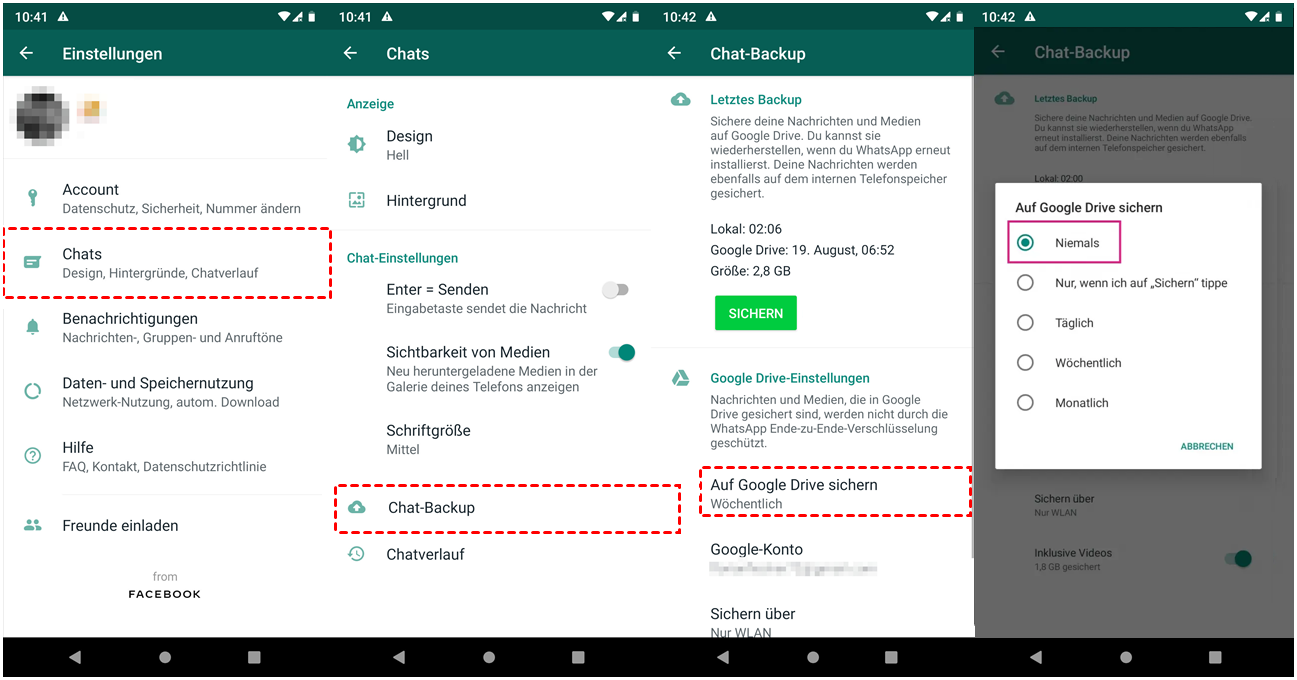 Öffnen Sie WhatsApp > Tippen Sie auf das Drei-Punkte-Symbol > Gehen Sie zu Einstellungen > Chats > Chat-Backup > „Auf Google Drive sichern“ und wählen Sie „Nie“.