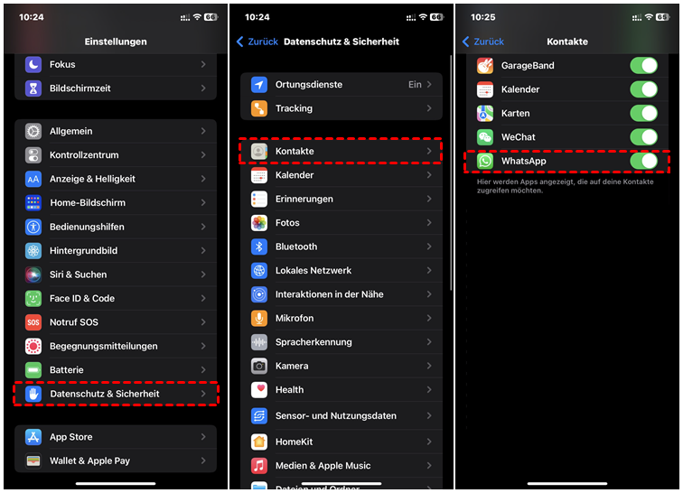 WhatsApp synchronisiert auf dem iPhone Kontakte nicht? Wie im letzten Teil erwähnt, müssen Sie zunächst prüfen, ob die entsprechenden WhatsApp-Berechtigungen ordnungsgemäß funktionieren. Wenn Sie während der Einrichtung die Berechtigung zum Zugriff auf Kontakte verweigert haben, gehen Sie zu den iPhone-Einstellungen, um sie zu aktivieren.