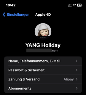✎ Hinweis: Um Datenverlust zu vermeiden, erstellen Sie bitte vor dem Löschen eine Sicherungskopie Ihrer Apple-ID. Stellen Sie außerdem sicher, dass Sie von allen Apple-Geräten abgemeldet sind. Abonnements vom alten Konto müssen auf ein anderes verfügbares Apple-ID-Konto verschoben werden.