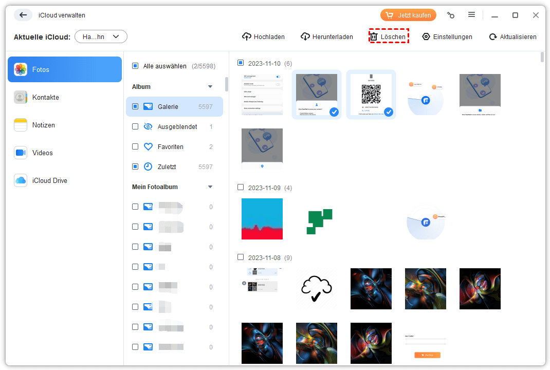 • Verwenden Sie die Tastenkombination Strg + Alt, um Fotos auszuwählen, die Sie aus iCloud löschen möchten > Klicken Sie oben rechts auf das Papierkorbsymbol, um Fotos aus iCloud zu löschen.