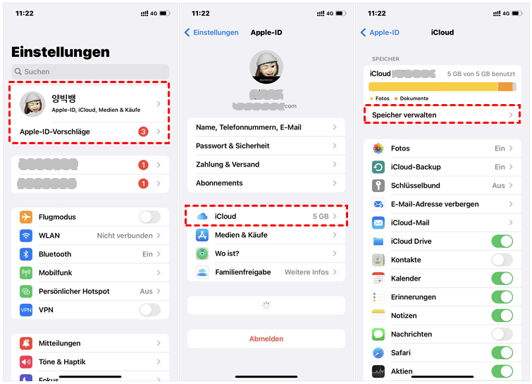 Schritt 2. Tippen Sie iCloud-Einstellungen auf Speicher verwalten. Sie können überprüfen, welche Daten in iCloud gespeichert wurden. Möglicherweise sind Fotos, Nachrichten, Kontakte oder Backups anderer Geräte vorhanden. Sie können die nicht benötigten Daten löschen, um Speicherplatz freizugeben.