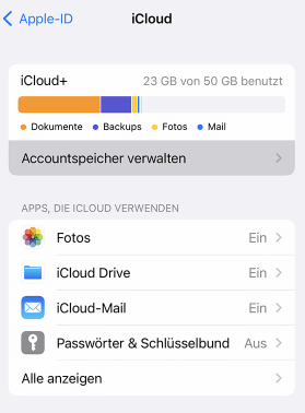 - Bilder und Videos werden in iCloud Fotos gesichert.