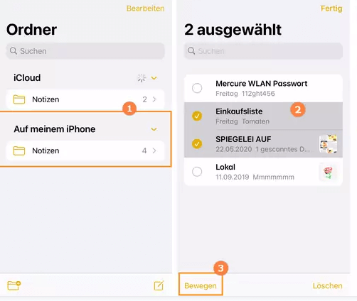 Schritt 2. Wählen Sie die Notizen aus, die Sie verschieben möchten (Sie können alle auswählen, indem Sie auf „Alle verschieben“ klicken oder auf einer einzelnen Notiz nach links wischen, um nur eine auszuwählen) > Tippen Sie auf „Bewegen“ und wählen Sie einen Ordner unter iCloud aus, um Ihre ausgewählten Notizen zu verschieben.