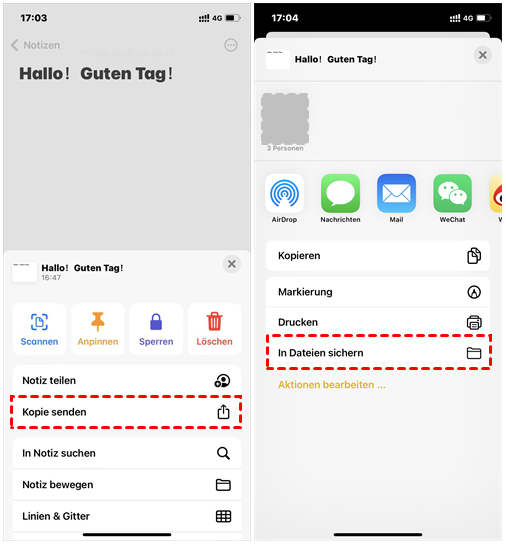 Schritt 2. Suchen Sie die Option „Kopie senden“, klicken Sie darauf und tippen Sie auf „In Dateien sichern“, um einen Ordner zum Speichern der Notizdateien auszuwählen.