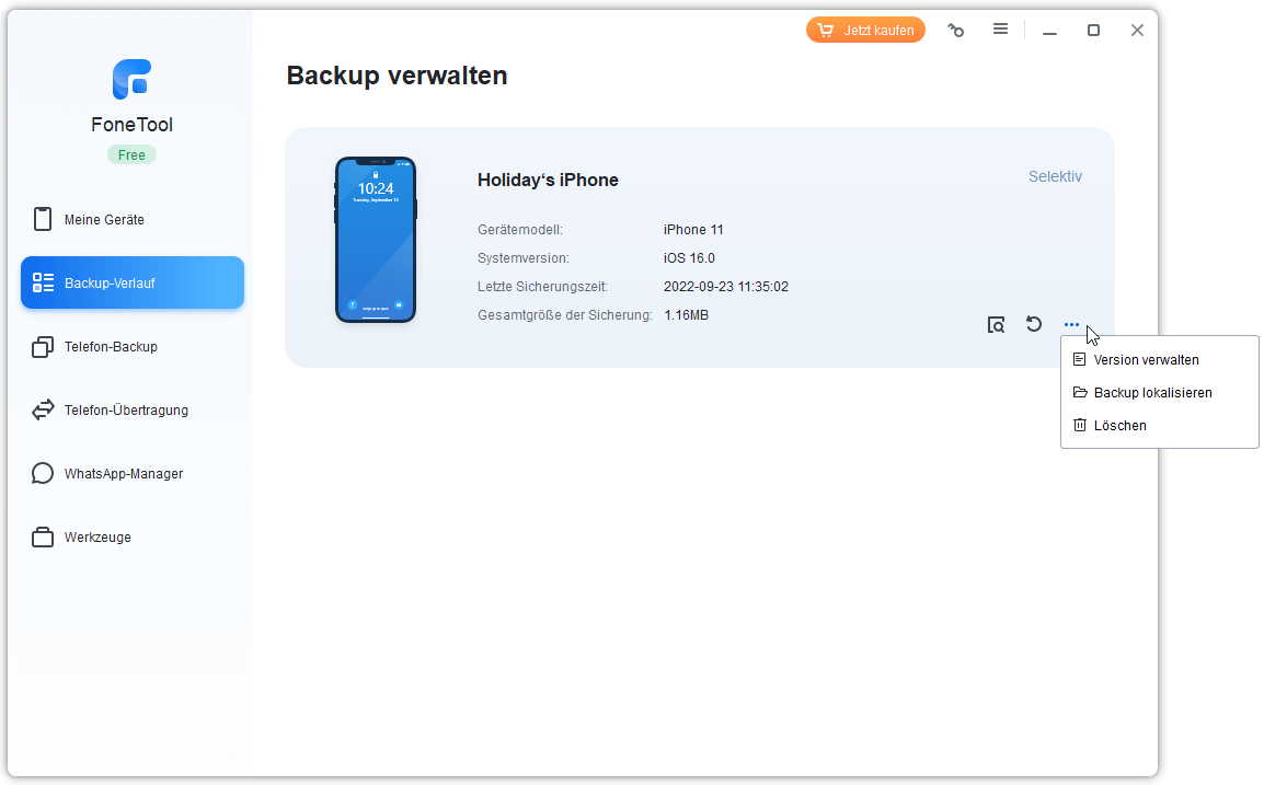 Wenn Sie jedoch nicht noch einmal von solchen Problemen betroffen sein möchten, nutzen Sie FoneTool, um Ihre Daten doppelt zu sichern. Neben der Sicherung Ihres iPhones können Sie mit FoneTool auch Daten übertragen oder Ihr iPhone mit wenigen Klicks löschen.