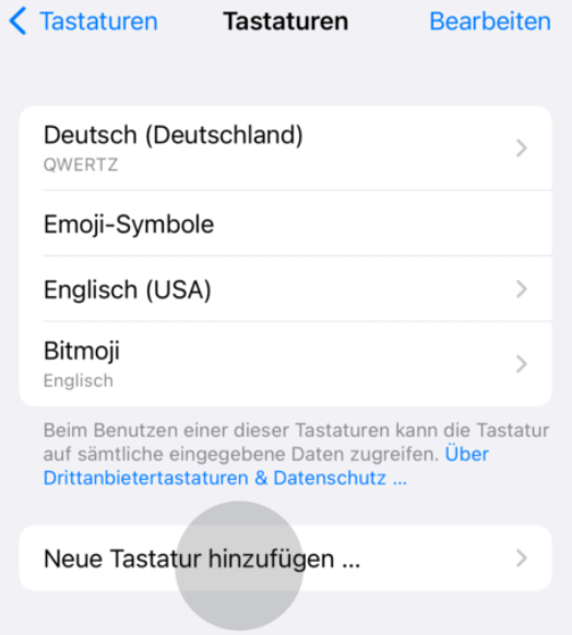 Stellen Sie sicher, dass die GIF-Tastatur aufgelistet und aktiviert ist. Wenn nicht, tippen Sie auf „Neue Tastatur hinzufügen“ und wählen Sie die GIF-Tastatur aus der Liste aus.