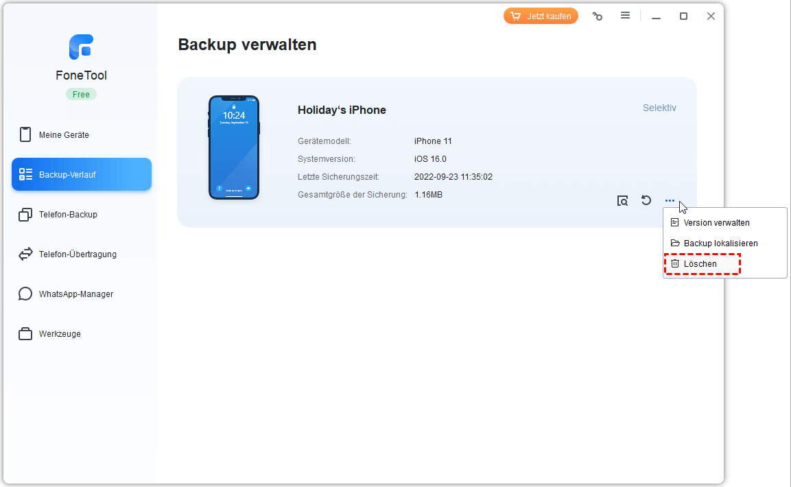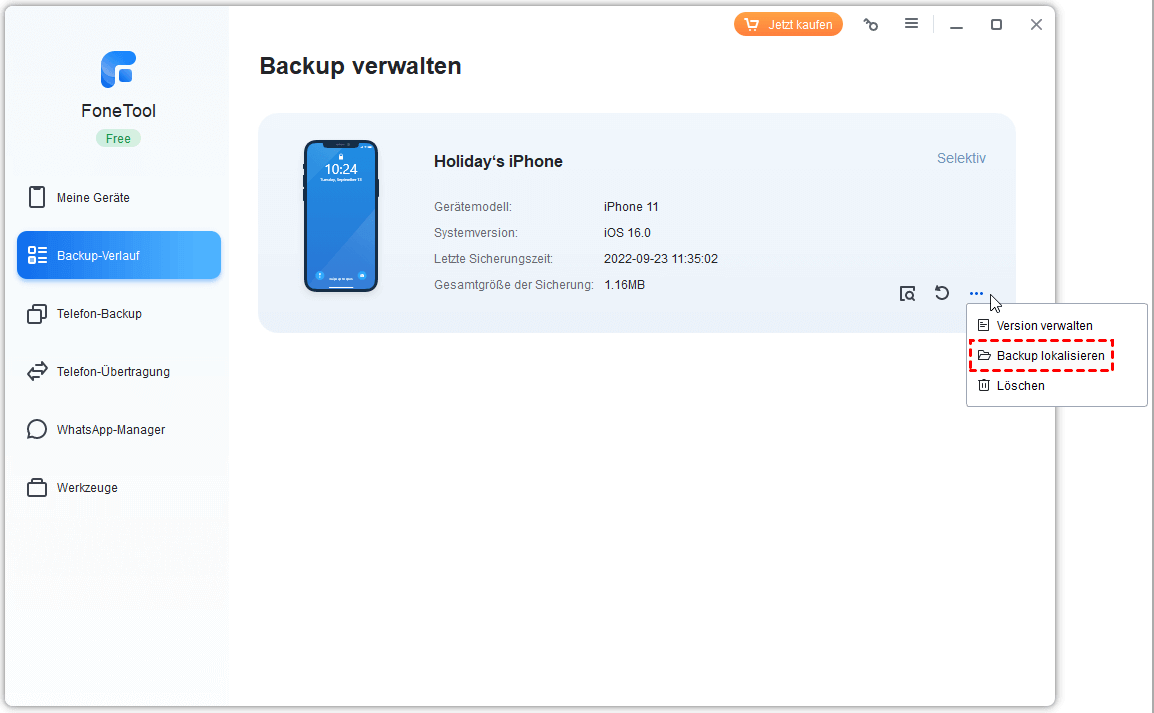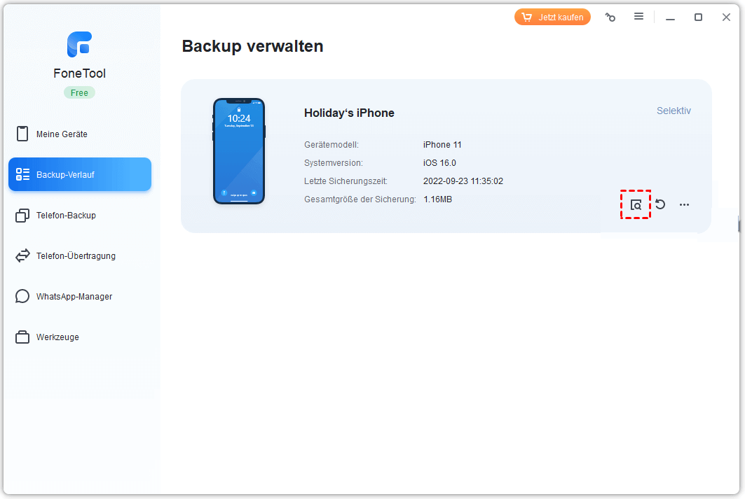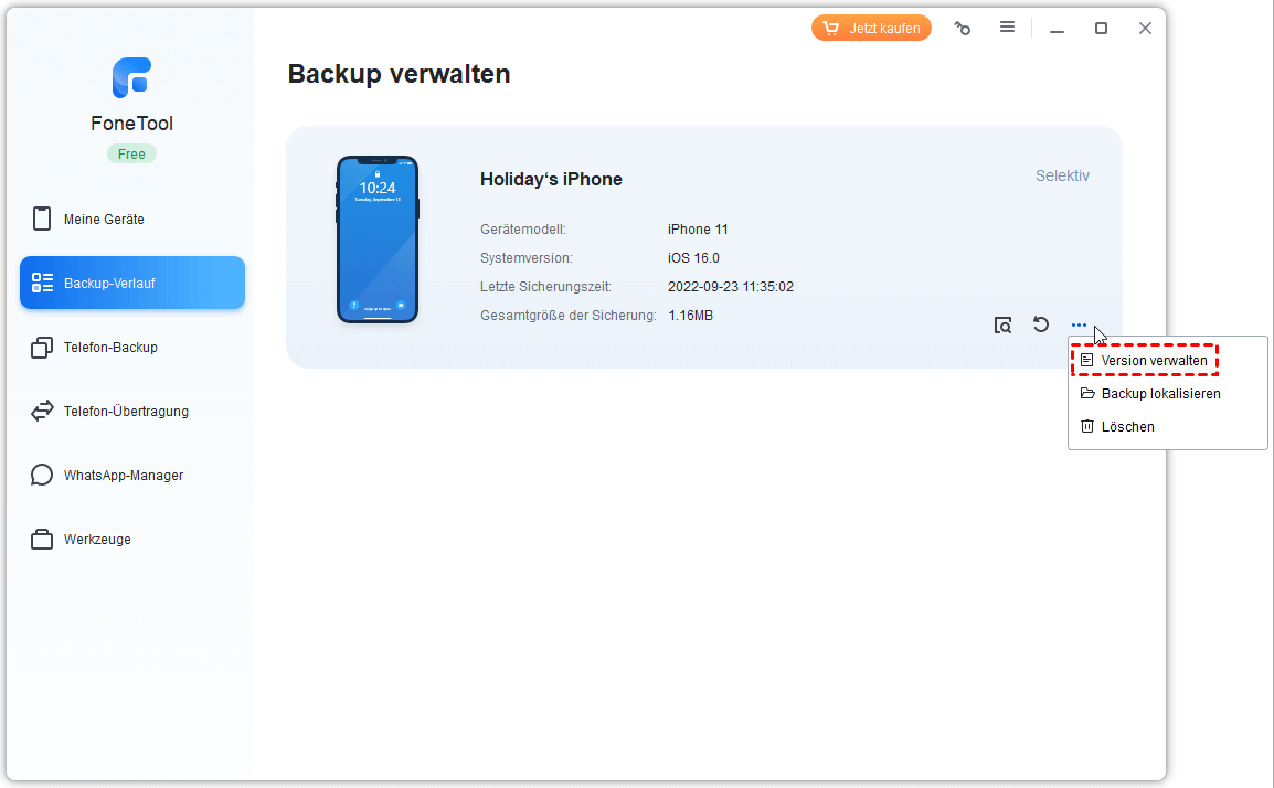 In FoneTool verwaltet es alle Backups eines Geräts nach Versionen. Jedes Mal, wenn eine Sicherung durchgeführt wird, wird eine neue Sicherungsversion generiert.