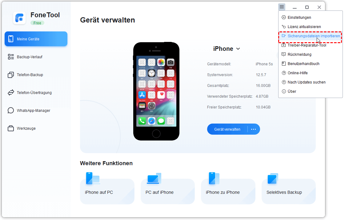 Klicken Sie auf die drei Linien oben rechts im Hauptfenster, wählen Sie „Sicherungsdateien importieren“, durchsuchen Sie dann die Sicherungs-Repository-Datei „mblibrary.db“ und wählen Sie sie aus. Anschließend werden die Aufgabe und die entsprechenden Sicherungsversionen in FoneTool importiert. Danach können Sie mit der Sicherung basierend auf der Aufgabe fortfahren.