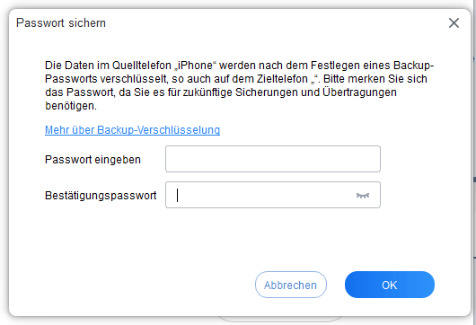 Tipp: Szenarien, die eine Überprüfung des Backup-Passworts erfordern: Durchsuchen, Sichern oder Wiederherstellen und bei Verwendung der iPhone-zu-iPhone-Übertragungsfunktion.