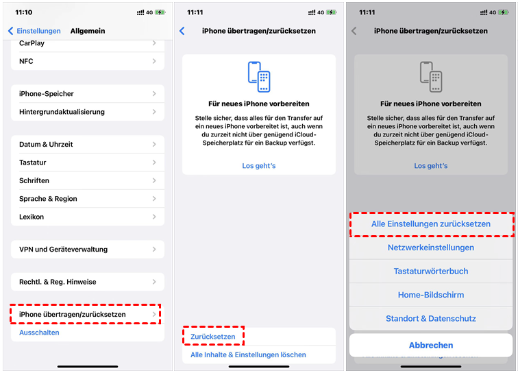 FoneTool unterstützt derzeit nicht das Ändern des Sicherungskennworts, nachdem es festgelegt wurde. Nach der Verschlüsselung wird das Backup-Passwort sicher in den Systemdateien Ihres iPhones gespeichert und kann nicht direkt eingesehen werden. Wenn Sie das Backup-Passwort vergessen, das Sie bei der Erstkonfiguration festgelegt haben, besteht die einzige Lösung darin, zu den Einstellungen Ihres iPhones zu gehen und diesem Pfad zu folgen: Allgemein > iPhone übertragen/zurücksetzen > Zurücksetzen, dann „Alle Einstellungen zurücksetzen“ auswählen, um das Passwort zu löschen, und Kehren Sie dann zu FoneTool zurück, um ein neues Passwort festzulegen.