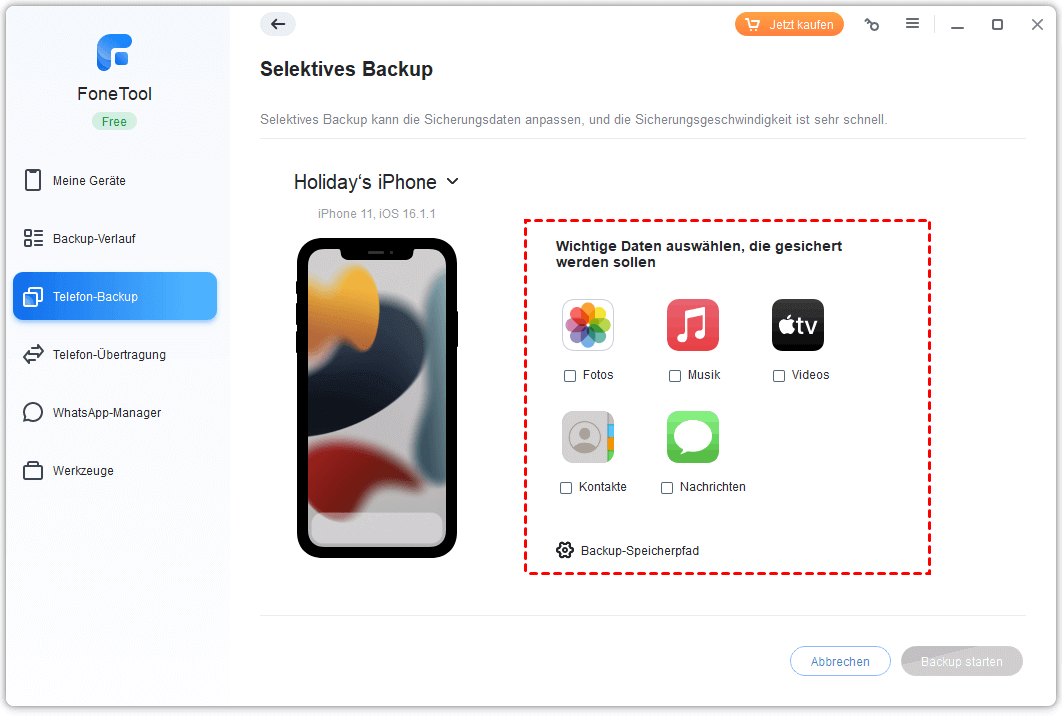 Schritt 2. Klicken Sie auf „Telefon-Backup“, fahren Sie mit der Maus über das Symbol „Selektives Backup“ und klicken Sie auf „Backup starten“.