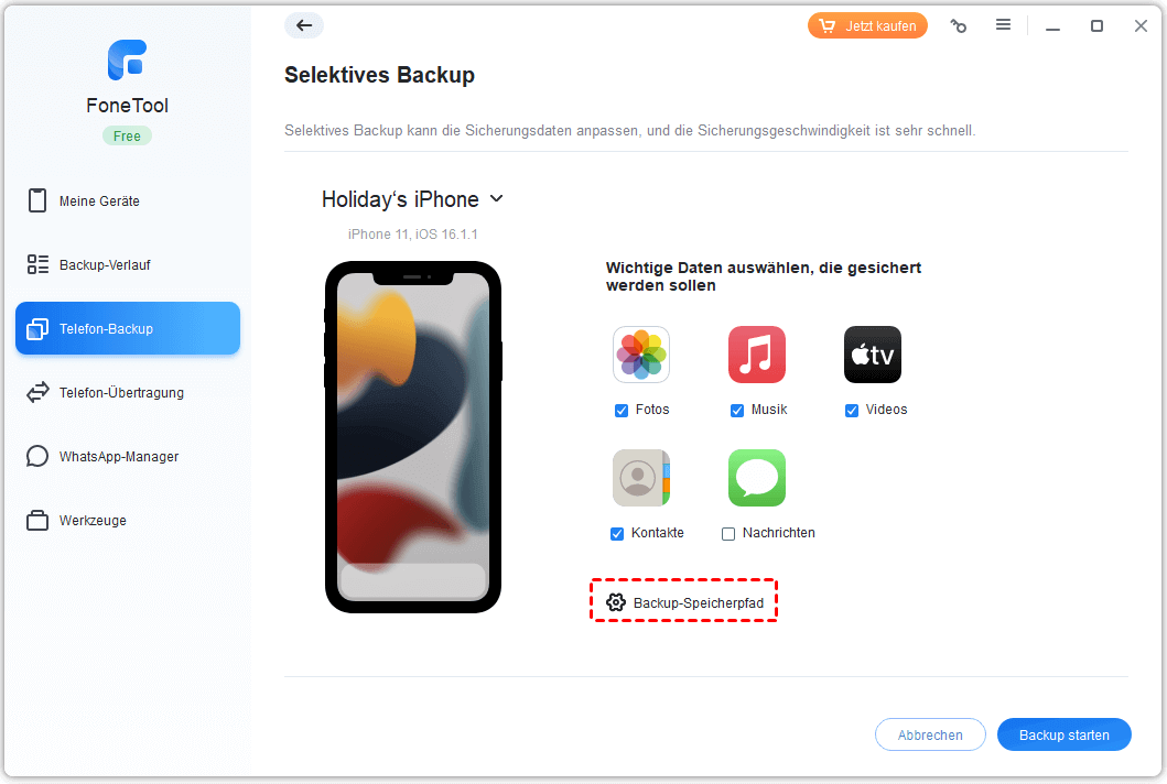 Mit FoneTool können Sie Fotos, Musik, Videos, Kontakte und Nachrichten auf iPhone-, iPad- und iPod Touch-Geräten sichern.