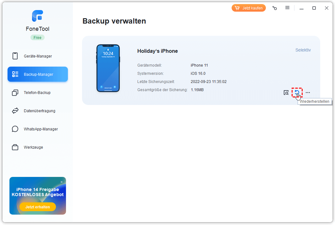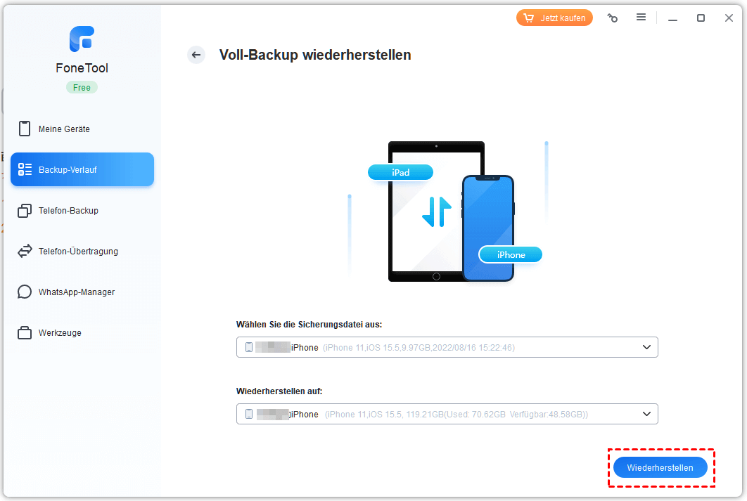 Mit FoneTool Voll-Backup Ihres iPhones erstellen