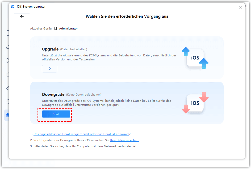 4. Um ein Downgrade durchzuführen, wählen Sie unten die Option „Downgrade“ und klicken Sie auf „Start“. Klicken Sie in ähnlicher Weise auf „Firm-Datei“, um die iOS-Version auszuwählen, zu der Sie zurückkehren möchten, und klicken Sie dann auf „Downgrade starten“, um den Downgrade-Vorgang zu starten.