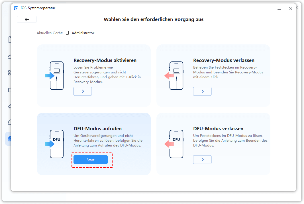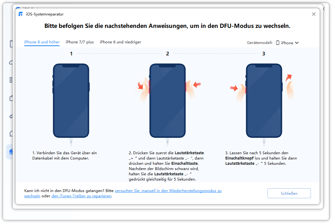 4. Um in den DFU-Modus zu wechseln, wählen Sie eine der Optionen auf der linken Seite aus.