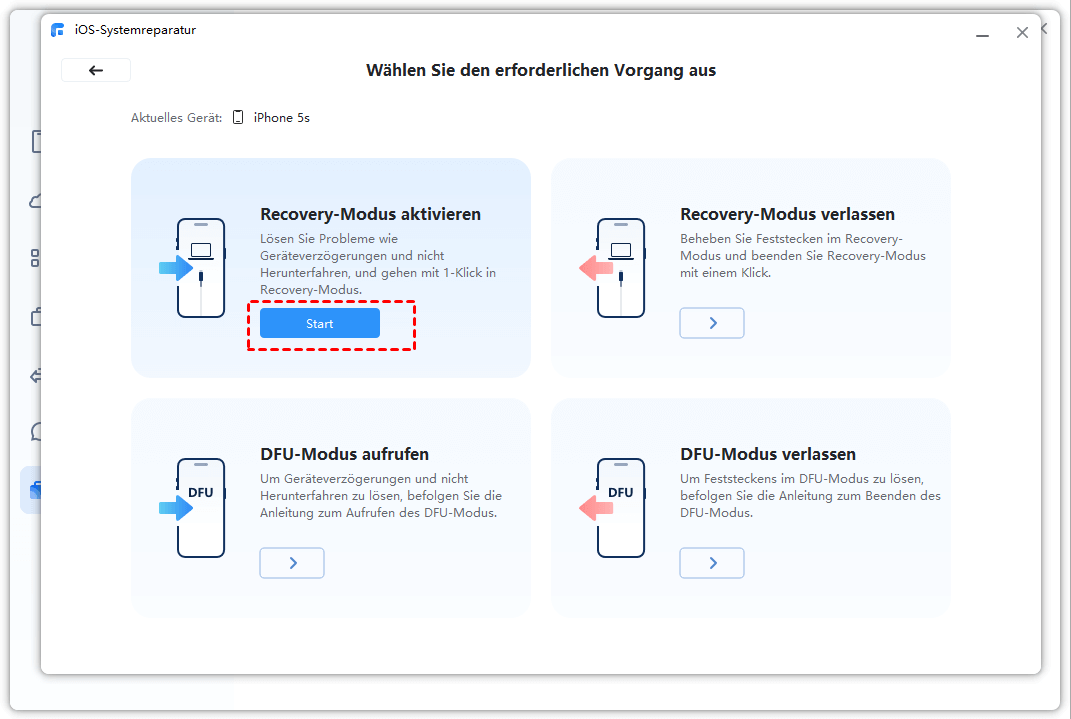 Bei bestimmten iOS-Systemproblemen wie dem Einfrieren des Geräts, der fehlenden Abschaltmöglichkeit oder dem Hängenbleiben im Wiederherstellungsmodus können Sie das Problem einfach dadurch beheben, dass Sie den Wiederherstellungsmodus aktivieren oder beenden, ohne eine vollständige Systemreparatur durchzuführen.