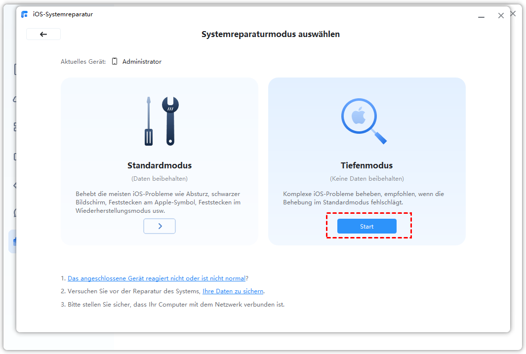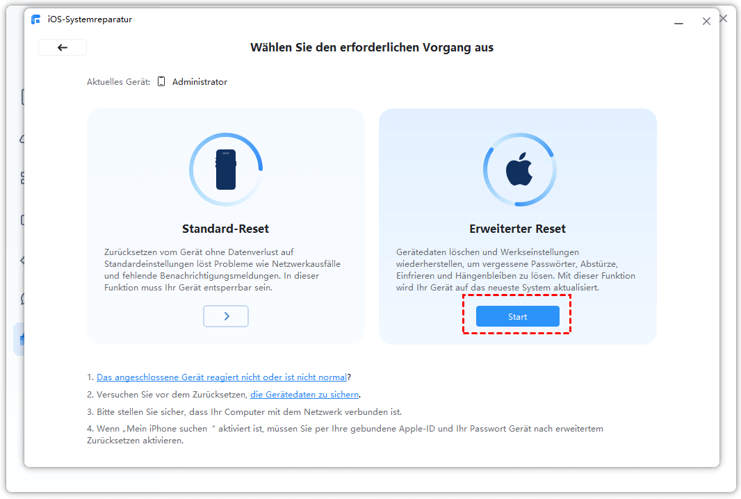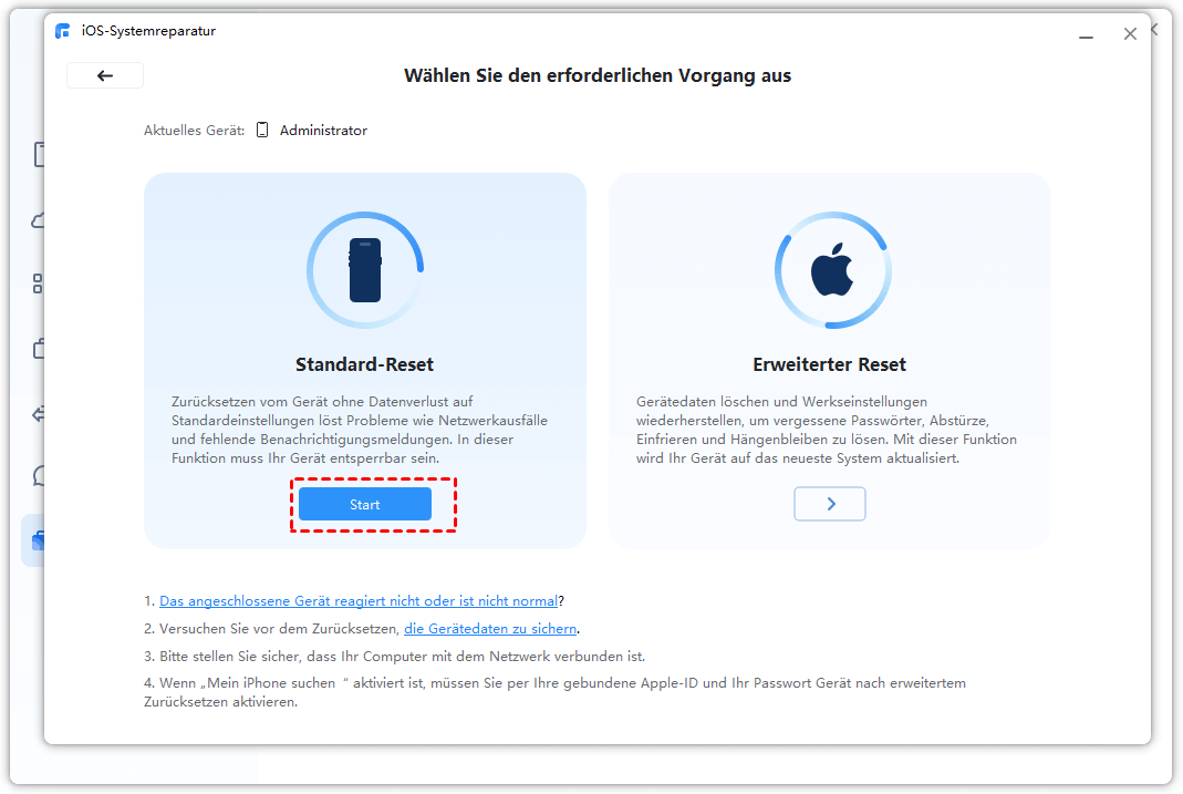 2. Wenn Sie das Gerät unter Beibehaltung aller Daten zurücksetzen möchten, wählen Sie links „Standard-Reset“ und klicken Sie auf „Start“. Stellen Sie sicher, dass Ihr iOS-Gerät entsperrt ist, bevor Sie fortfahren.