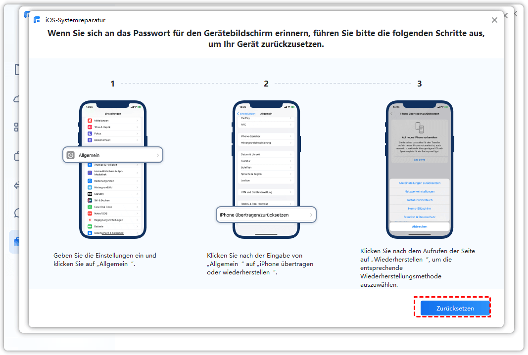 3. Nachdem Sie auf „Start“ geklickt haben, befolgen Sie bitte die in der Abbildung dargestellten Schritte, um den Reset-Vorgang einzuleiten.