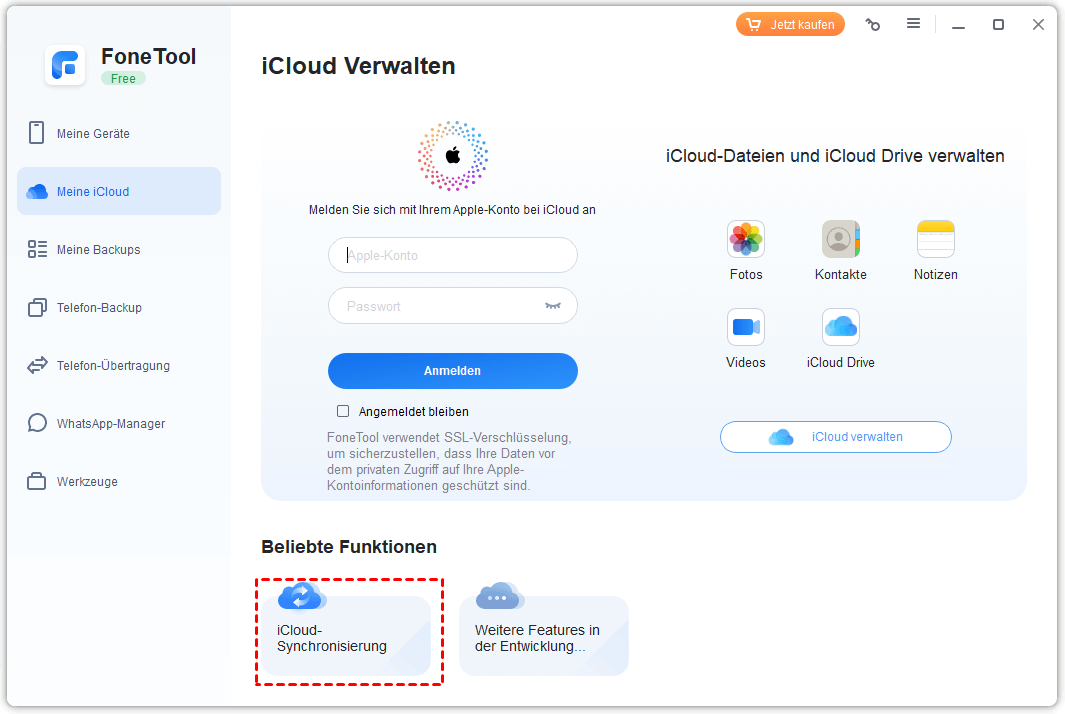 Starten Sie FoneTool und wählen Sie im Navigationsbereich auf der linken Seite „iCloud verwalten“, um auf die Benutzeroberfläche „Meine Cloud“ zuzugreifen. Geben Sie in der Benutzeroberfläche „Mein iCloud“ Ihre Apple-ID und Ihr Passwort ein und klicken Sie auf „Anmelden“.