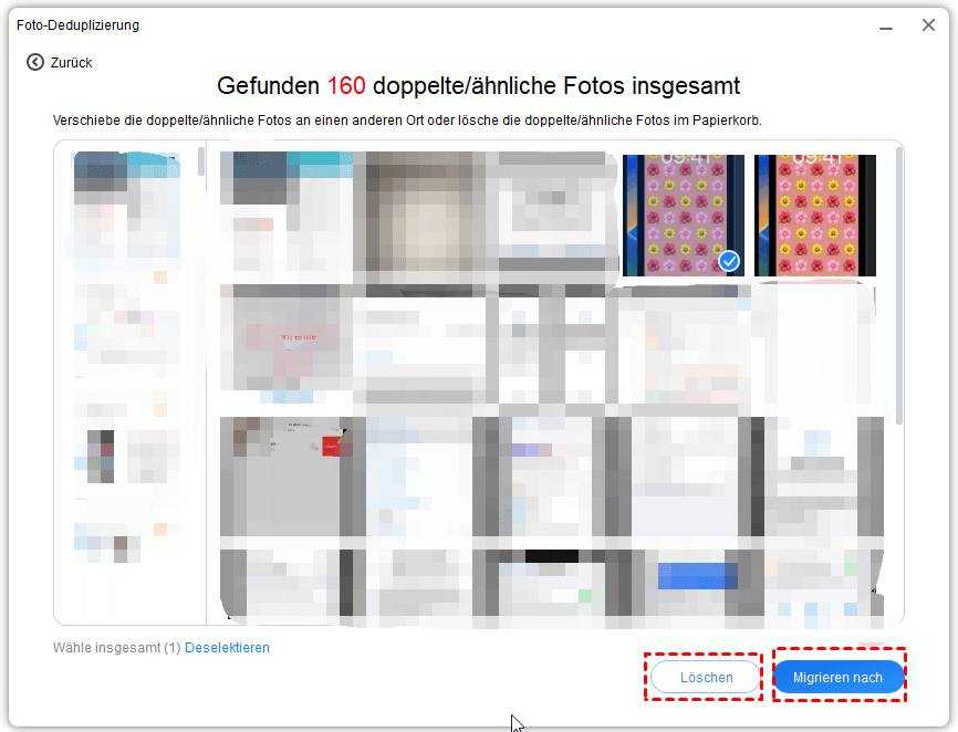 Schritt 4: Wählen Sie auf der passenden Ergebnisseite die Fotos aus. Wenn Sie auf die Schaltfläche „Löschen“ klicken, werden die ausgewählten Fotos in den Ordner „Gelöschte Fotos xxx“ im Papierkorb verschoben. Wenn Sie auf die Schaltfläche „Migrieren nach“ klicken, werden die ausgewählten Fotos vom ursprünglichen Speicherort in den angegebenen Computerpfad verschoben.