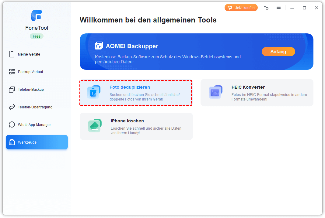 Schritt 1: Klicken Sie in der Werkzeugleiste von FoneTool Home-Oberfläche auf die Funktion „Foto deduplizieren“.