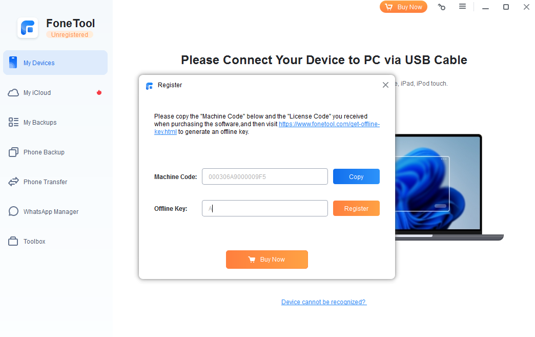 Schritt 1. Starten Sie FoneTool ohne Internetverbindung, damit Sie ein Offline-Registrierungsfenster erhalten. Stellen Sie dann eine Verbindung zum Internet her und öffnen Sie die URL (https://www.aomeitech.com/offline-key.html) im Offline-Registrierungsfenster wie folgt. Sie können die URL auch auf einem anderen Computer mit Internetverbindung öffnen.