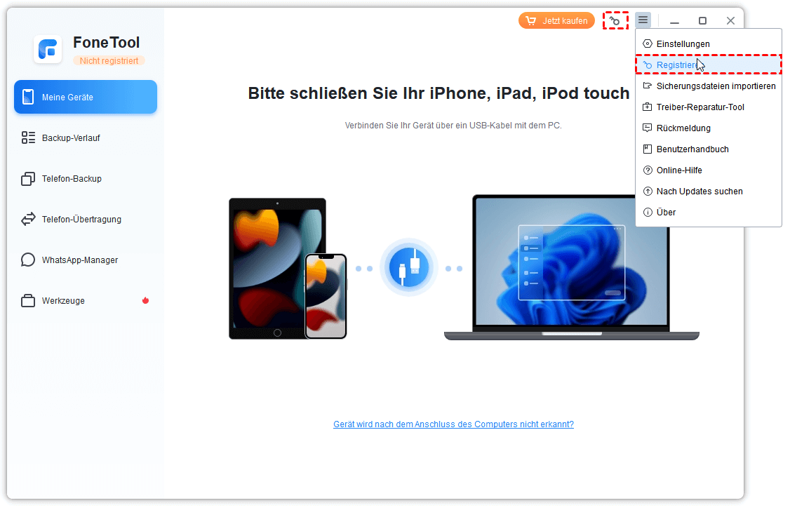 Schritt 1. Starten Sie FoneTool. Es erscheint ein Registrierungs-Pop-Fenster. Wenn Sie das Popup-Fenster nicht sehen oder es versehentlich schließen, können Sie auch auf die Schaltfläche „Menü“ – „Registrieren“ klicken oder auf das Schlüsselsymbol in der oberen rechten Ecke klicken.