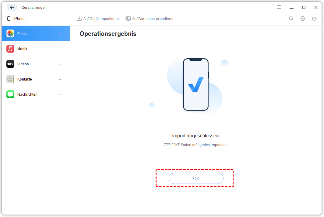 Schritt 4: Sobald die Übertragung abgeschlossen ist, klicken Sie auf „OK“. Sie finden Ihre übertragenen Fotos jetzt im angegebenen Album in der Fotos-App auf Ihrem iOS-Gerät.