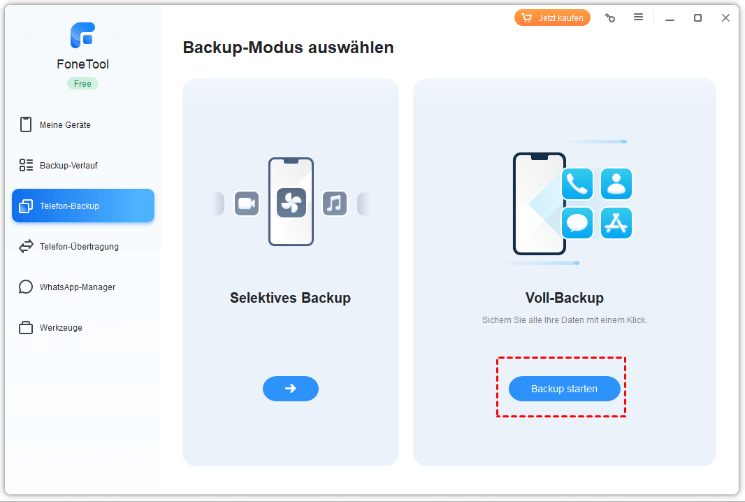 Öffnen Sie FoneTool und klicken auf Telefon-Backup > Voll-Backup > Backup starten.