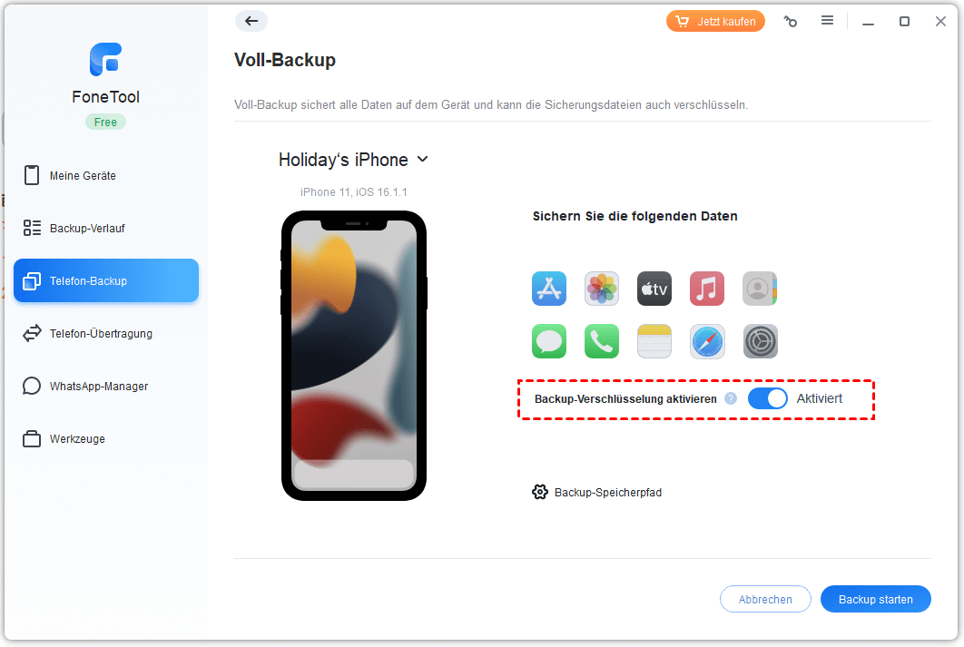 Wählen Sie, ob Sie Backup-Verschlüsselung aktivieren möchten, klicken auf Backup-Speicherpfad um das Ziel zu ändern, und tippen auf Backup starten.