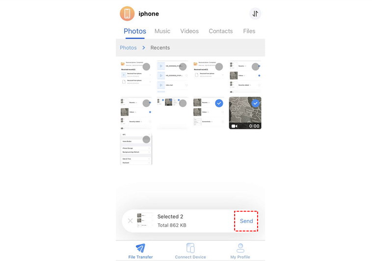 Schritt 4. Gehen Sie auf dem Quell-iPhone zu „File Transfer“ > wählen Sie die Fotos aus, die Sie übertragen möchten > tippen Sie auf „Send“.