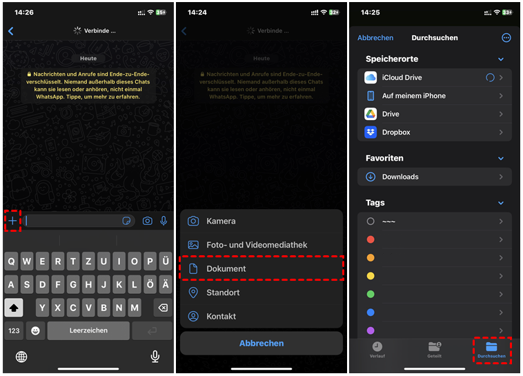 Schritt 2. Öffnen Sie WhatsApp > öffnen Sie einen Chat und klicken Sie auf das Plus-Symbol > tippen Sie auf Dokumente > suchen Sie die Fotos in der App „Dateien“ und wählen Sie sie aus (Sie können auf das Symbol mit den drei Punkten tippen > auswählen, um alle benötigten Fotos auszuwählen).