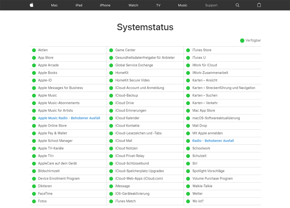 Wenn es ein Problem mit dem Dienst gibt, platziert Apple unter dem Dienst einen anklickbaren Link mit möglichen Optionen.
