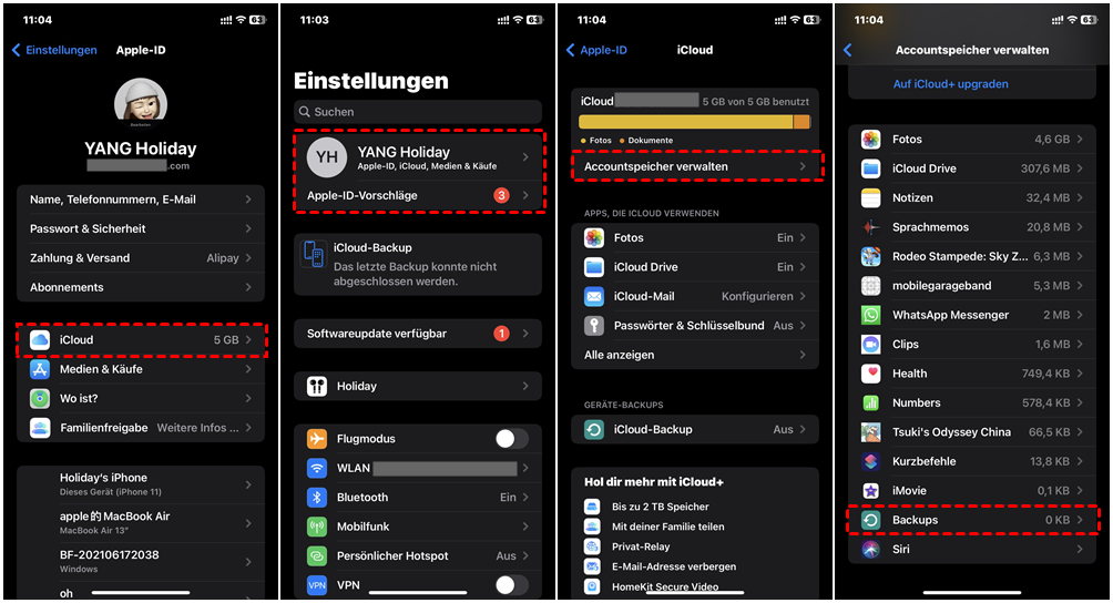 - Deaktivieren Sie die Datensicherung für nicht benötigte Apps. Gehen Sie zu „Einstellungen“ > „[Ihr Name]“ > „iCloud“ > „Account-Speicher verwalten“ > „Backups“ > Tippen Sie auf Ihr Gerät > Tippen Sie auf „Alle Apps anzeigen“ und deaktivieren Sie die nicht benötigten Apps > Tippen Sie zur Bestätigung auf „Ausschalten“.