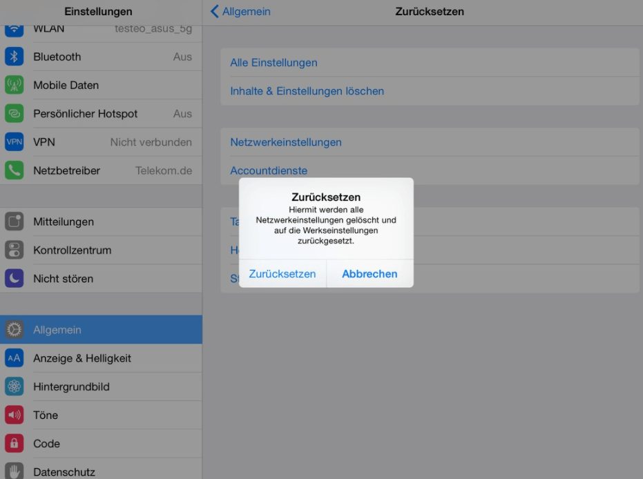 Wenn Sie die Netzwerkeinstellungen zurücksetzen müssen, gehen Sie zu: Einstellungen > Allgemein (oder iPad übertragen/zurücksetzen > Zurücksetzen für iPadOS 14 und höher) > Zurücksetzen > Netzwerkeinstellungen zurücksetzen. Geben Sie den Passcode zur Bestätigung ein.