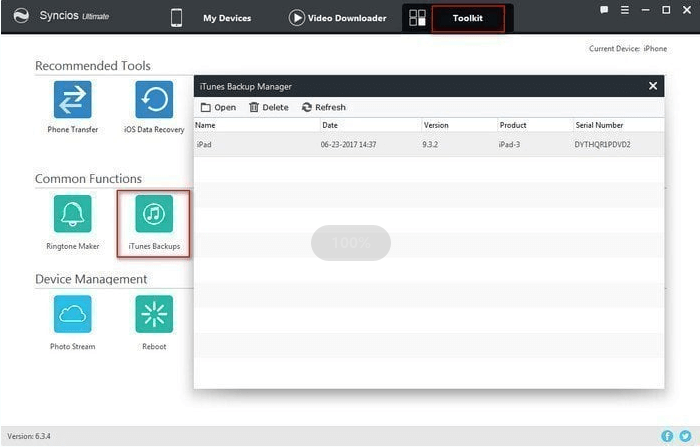 Schritt 2. Klicken Sie im Fenster auf Toolkit und wählen dann iTunes-Backups aus. Syncios würde Ihre iTunes-Backups automatisch finden. Dann müssen Sie auswählen, welches gescannt werden soll, und auf „Öffnen“ klicken.