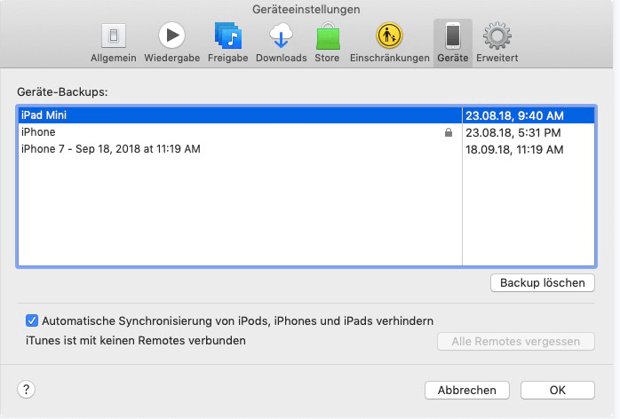 Gehen Sie in der Menüleiste von iTunes zu Bearbeiten > Einstellungen > Geräte. Das Schlosssymbol neben dem Namen des Geräts bedeutet, dass Ihr iPhone-Backup verschlüsselt ist.
