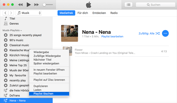 ▶ Schritt 2. Klicken Sie mit der rechten Maustaste auf eine intelligente Wiedergabeliste und klicken Sie auf die Option Playliste löschen.