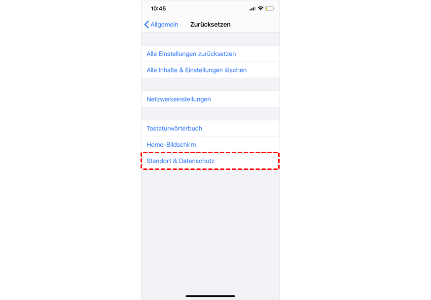 Manchmal sind die Standort- und Datenschutzeinstellungen auf dem iPhone möglicherweise beschädigt, was auch ein Grund dafür sein kann, dass der iTunes Fehler 0xE80000A auftritt. Das Zurücksetzen der Standort- und Datenschutzeinstellungen auf dem iPhone kann das Problem möglicherweise beheben.
