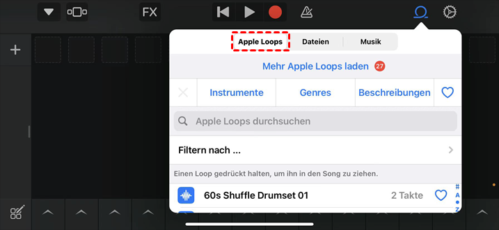 Tippen Sie auf das „Projekt“-Symbol und dann auf das „Apple Loop“-Symbol, das sich in der oberen rechten Ecke des Bildschirms befindet.