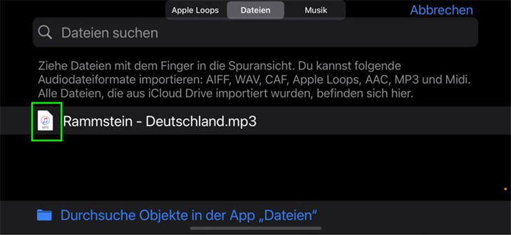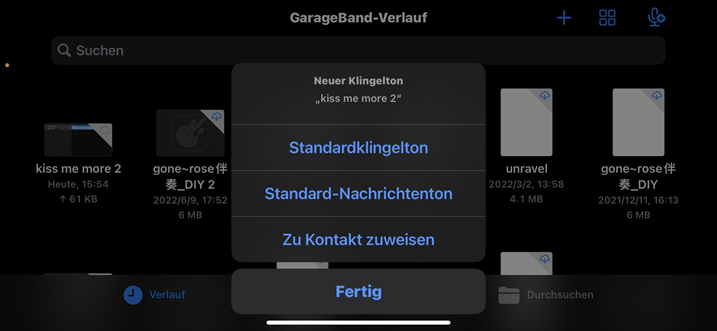 Wählen Sie „Dateien“ > Tippen Sie in der „Dateien-App auf Elemente durchsuchen“ > Suchen Sie den gewünschten Klingelton > Wählen Sie den Klingelton aus > Drücken Sie dann lange auf den Klingelton, um ihn in GarageBand zu importieren.